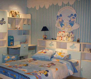 浅浅的粉蓝色给人宁静又不失活泼的感觉,配上米奇让整个房间更显童趣。米奇是多少儿童喜欢的动画人物呀!不仅让孩子的房间增添了趣味,也让孩子睡得快乐,舒服!
