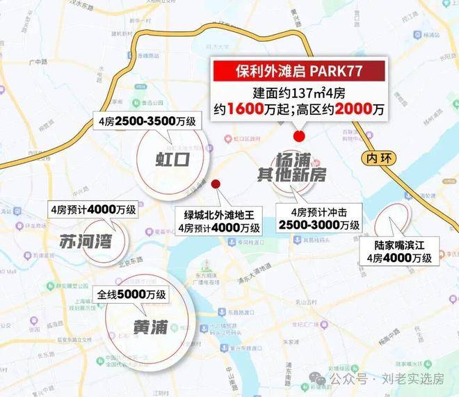 北外滩地王4房预计售价4000万级;虹口其他新房4房价格普遍在2500-3500万;静安苏河湾4房预计4000万级;陆家嘴滨江4房同样4000万级。如此对比之下,保利外滩启PARK77高区2000万级4房的价值,可谓市中心“独一份”。