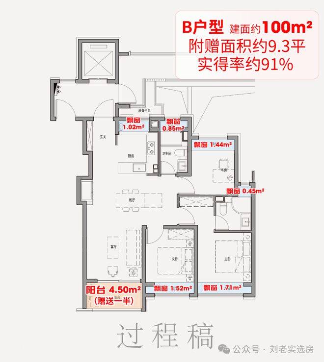 一方面,全系户型标配“全屋飘窗(全赠送)+大阳台(半赠送)”,经专业测算,百平米中间套实得率约91%,赠送面积达9.3㎡,相当于一间次卧。